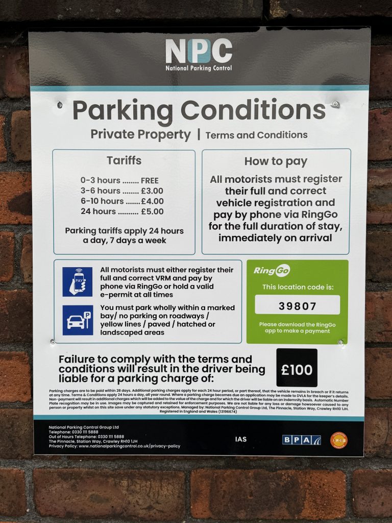 Charges will be issued to unregistered vehicles and any vehicles that are not parked in designated parking bays. Parking conditions can be found on our signage displayed around the centre – see image below.